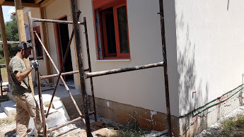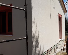 This includes installation of windows, doors and shutters. Adding the external plaster board finish over the insulation. More plaster and a rendering coat is added to the exterior and painting window and door frames. After this point, steps and patio will be added and landscaping will occur.